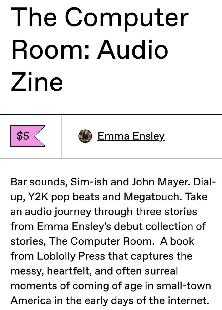 The Computer Room oozes ambient warmth laced with humor and pricked with delightful bursts of weirdness. From the punk show to the recovery blog to tradwife TikTok to the dive bar--from the tenderly nostalgic to the giddily speculative--Ensley delicately excavates the digital and deeply human ties that bind us.
